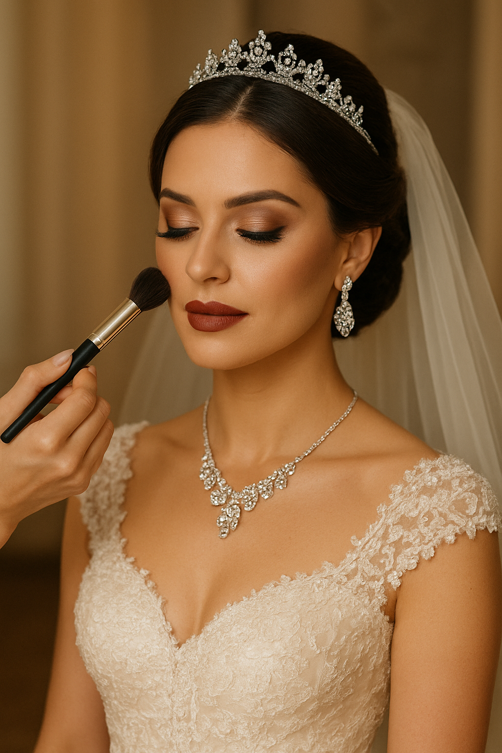 • Kit de retoque básico para el gran día: polvos translúcidos, borla, papel matificante y tono de labial.